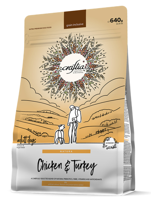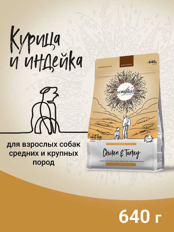 Повседневные корма Craftia Сухой корм CRAFTIA NATURA для взрослых собак средних и крупных пород из курицы и индейки 640 г