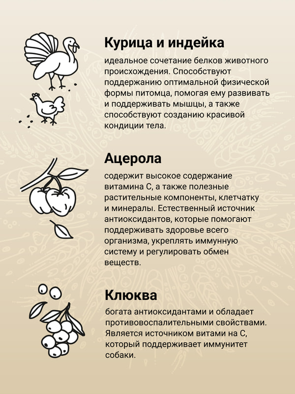 Основные источники белка в корме — свежее мясо курицы и индейки. Комбинация этих белков легко переваривается, помогает поддерживать оптимальный вес питомца, стабилизирует обмен веществ. Курица и индейка — отличные источники незаменимых аминокислот, витаминов и минералов.