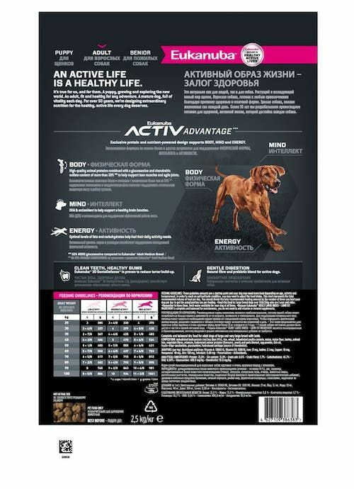 ПТИЦА - ИНГРЕДИЕНТ №1 ФИЗИЧЕСКАЯ ФОРМА Высококачественные животные белки в сочетании с увеличенным более чем на 50%* содержанием глюкозамина и хондроитинсульфата помогают поддерживать оптимальную мышечную массу и работу суставов по сравнению с рационом Eukanub Adult Medium Breed 2. ИНТЕЛЛЕКТ (ДГК) И АНТИОКСИДАНТЫ для поддержания эффективной работы мозга.3. АКТИВНОСТЬ Оптимальный уровень жиров и углеводов способствует поддержанию повседневной физической активности.4. ЧИСТЫЕ ЗУБЫ, ЗДОРОВЫЕ ДЕСНА Комплекс Eukanuba 3D DentaDefense (3Д ДентаДефенс) способствует уменьшению образования зубного камня. 5. КОМФОРТНОЕ ПИЩЕВАРЕНИЕ Натуральная клетчатка и комплекс пребиотиков для активных собак.
