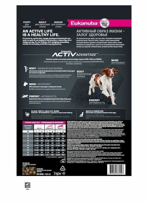 ПТИЦА - ИНГРЕДИЕНТ №1ФИЗИЧЕСКАЯ ФОРМА Белки животного происхождения в сочетании с глюкозамином и хондроитинсульфатом помогают сохранить нормальную мышечную массу, а также подвижность суставов.2. ИНТЕЛЛЕК (ДГК) И АНТИОКСИДАНТЫ для поддержания эффективной работы мозга.3. АКТИВНОСТЬ Оптимальный уровень жиров и углеводов способствует поддержанию повседневной физической активности.4. ЧИСТЫЕ ЗУБЫ, ЗДОРОВЫЕ ДЕСНЫ Комплекс Eukanuba 3D DentaDefense (3Д ДентаДефенс) способствует уменьшению образования зубного камня.5. КОМФОРТНОЕ ПИЩЕВАРЕНИЕ Натуральная клетчатка и комплекс пребиотиков для активных собак.