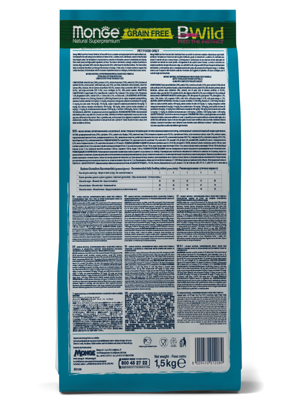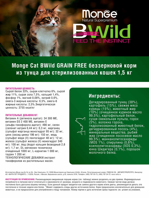 Monge (Монж) Cat BWild GRAIN FREE (холистик) полнорационный беззерновой корм из тунца и гороха для стерилизованных кошек и котов 1,5 кг.