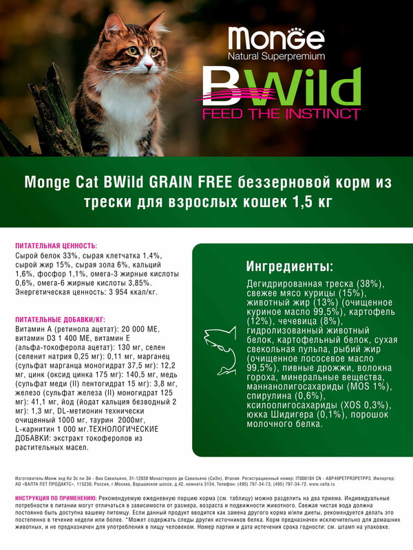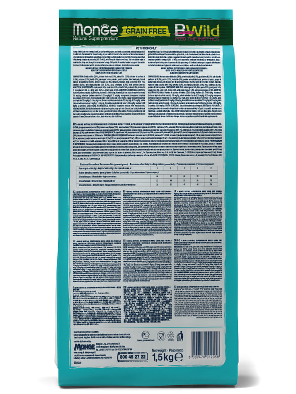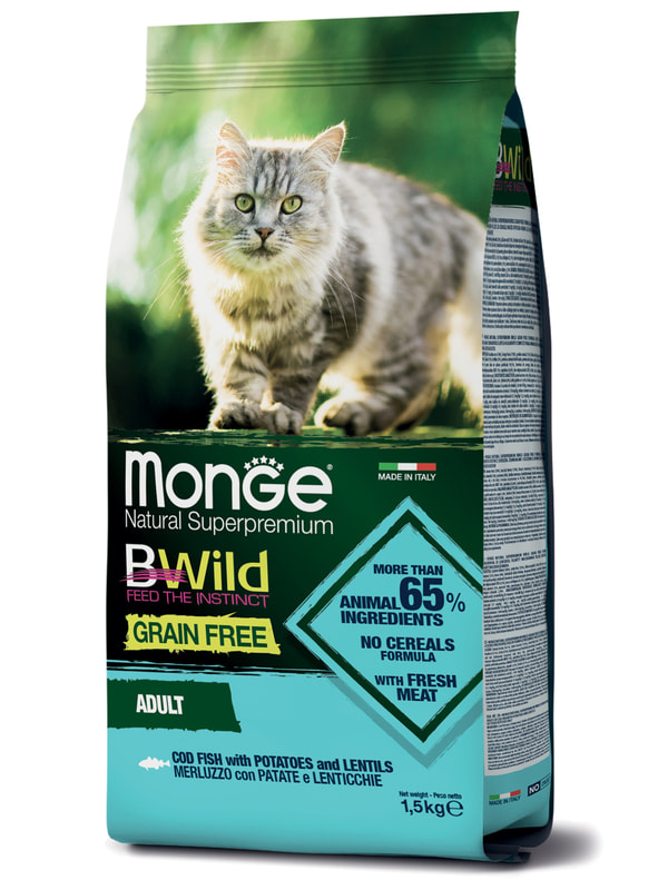 Monge (Монж) Cat BWild GRAIN FREE (холистик) полнорационный беззерновой корм из трески, картофеля и чечевицы для взрослых кошек и котов 1,5 кг.