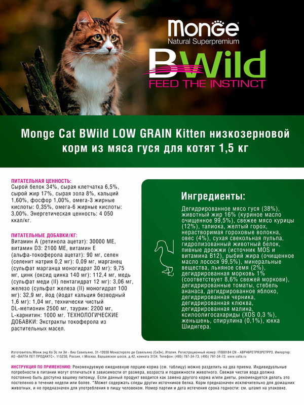 Monge (Монж) Cat BWild LOW GRAIN Kitten (холистик) полнорационный низкозерновой корм из мяса гуся для котят и беременных кошек 1,5 кг.