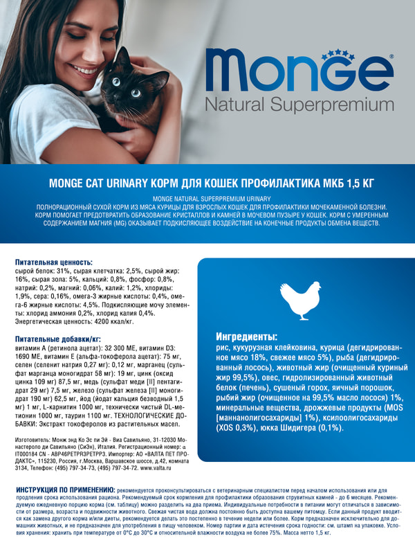Monge (Монж) Cat Urinary сухой корм из мяса курицы для профилактики МКБ у взрослых кошек и котов 1,5 кг.