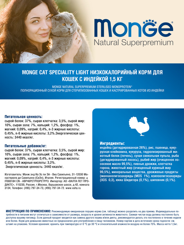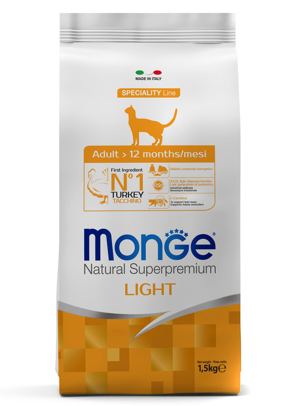 Monge (Монж) Cat Speciality Light сухой низкокалорийный корм из мяса индейки для взрослых кошек и котов 1,5 кг.