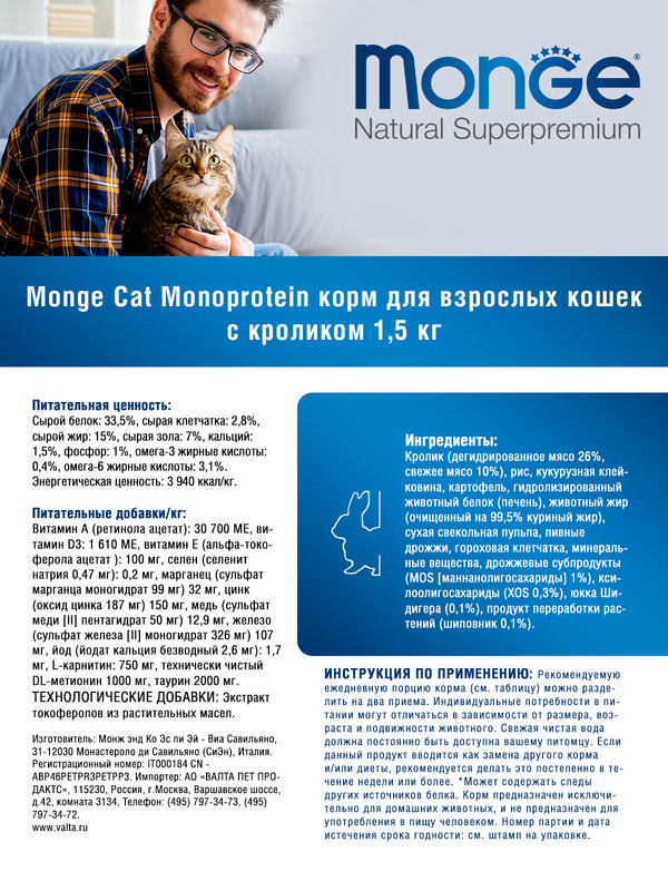Monge (Монж) Cat Speciality Line Monoprotein сухой корм из мяса кролика для взрослых кошек и котов 1,5 кг.