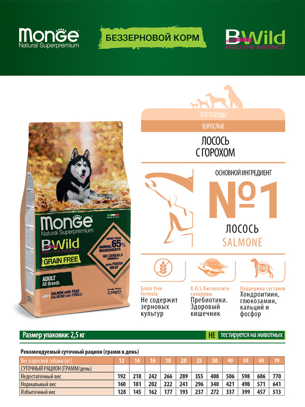 Monge (Монж) Dog BWild GRAIN FREE (холистик) беззерновой сухой корм из лосося и гороха для взрослых собак всех пород 2,5 кг.