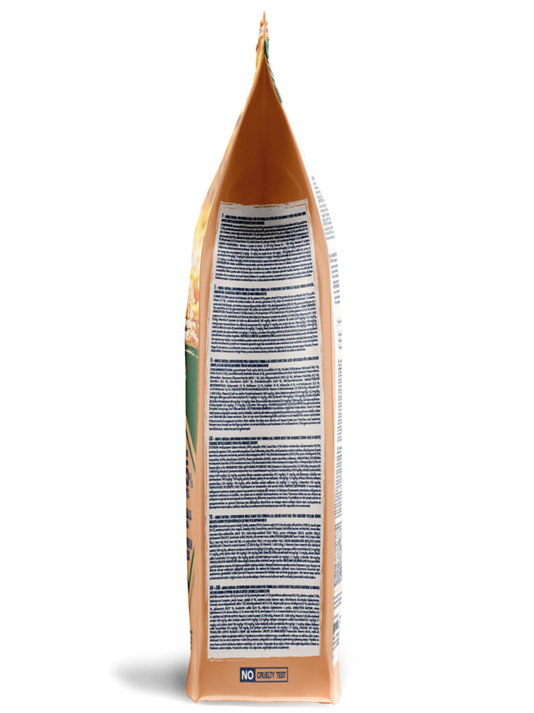 Ингредиенты: Дегидрированный лосось (38%), картофель (16%), животный жир (15%) (очищенное куриное масло 99,5%), свежее мясо курицы (12%), картофельный белок, пивные дрожжи, горох (4%), сухая свекольная пульпа, гидролизованный животный белок, минеральные вещества, маннанолигосахариды (M.O.S. 1%), ксилоолигосанхариды (X.O.S. 0,3%), юкка Шидигера (0,3%), спирулина (0,3%), глюкозамин (0,057%), хондроитина сульфат ( 0,04%), сухой молочный белок.