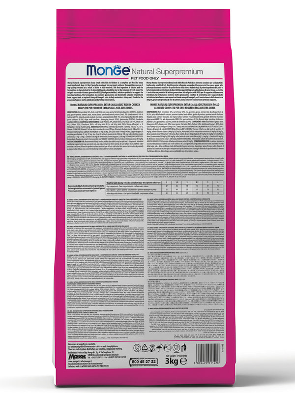 Полнорационный сбалансированный корм, разработанный специально для ежедневного кормления взрослых собак миниатюрных пород с нормальной физической активностью. Основой рациона является легкоусвояемое мясо курицы.Пребиотики М.О.S и X.O.S. помогают сохранять естественный баланс кишечной микрофлоры и способствует оптимальному усвоению питательных веществ.Глюкозамин, хондроитин, кальций и фосфор, в данном рационе, для поддержания здоровья суставов опорно-двигательного аппарата.Омега-3 и Омега-6 жирные кислоты в составе корма чрезвычайно важны для поддержания красоты шерсти и здоровья кожи.Без ГМО, искусственных красителей и ароматизаторов. Сделано в Италии.