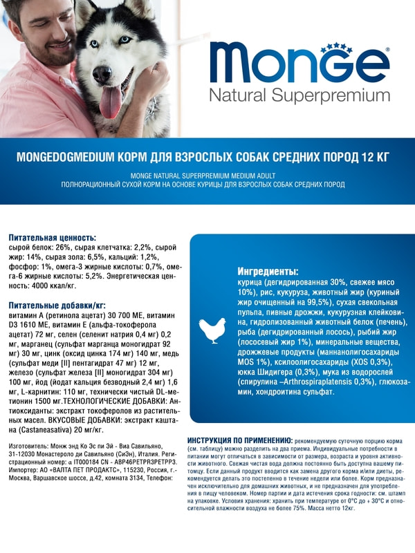 Monge (Монж) Dog Daily Line Medium сухой корм из мяса курицы для взрослых собак средних пород 12 кг.