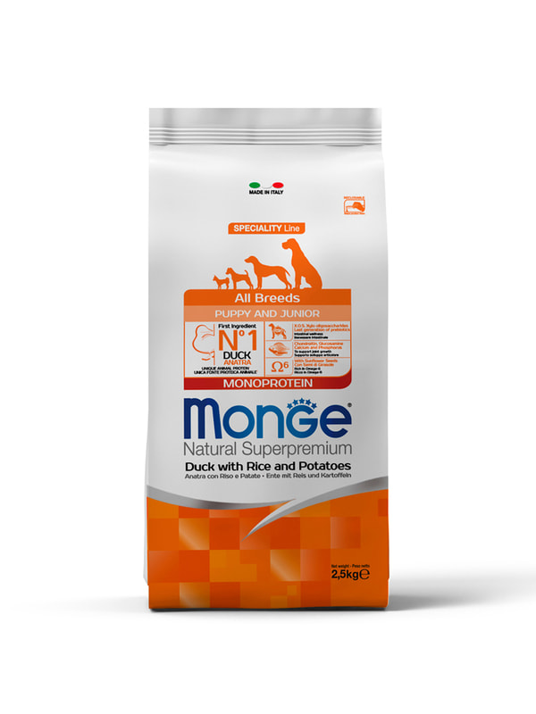 Monge (Монж) Dog Speciality Line Puppy & Junior All Breeds сухой корм из утки с рисом и картофелем для щенков всех пород 2,5 кг.