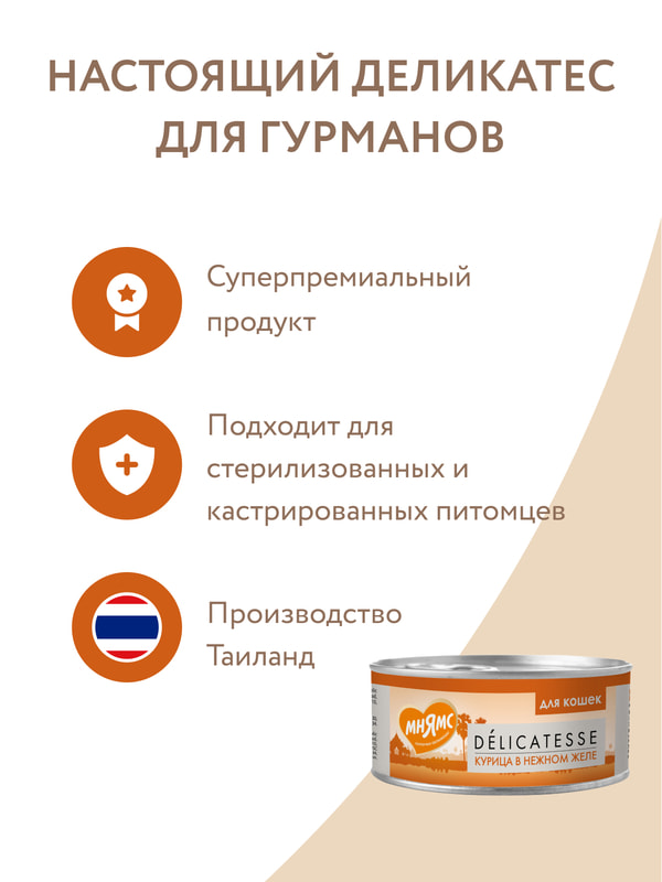 Консервы для кошек «Мнямс» состоят исключительно из отборных натуральных компонентов и не содержат сою, искусственные красители и усилители вкуса.