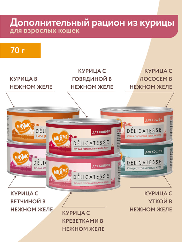 Консервы для кошек «Мнямс» состоят исключительно из отборных натуральных компонентов и не содержат сою, искусственные красители и усилители вкуса.