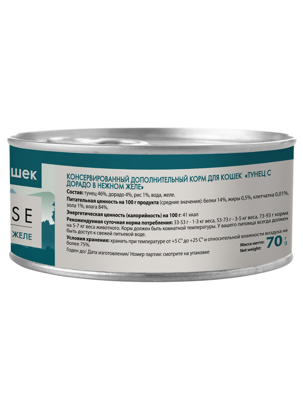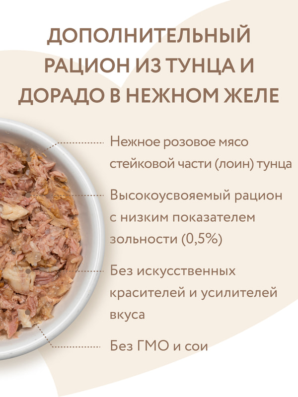 Ингредиенты: тунец 46%, дорадо 4%, рис, вода, желе.