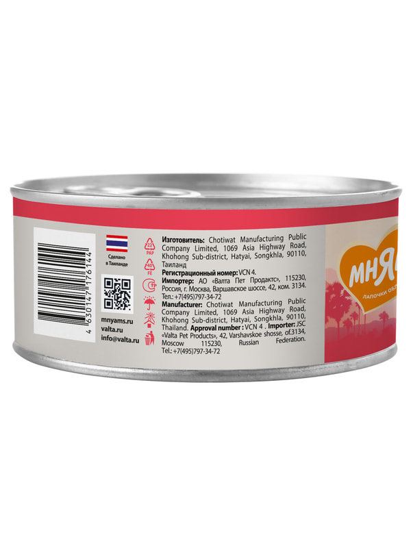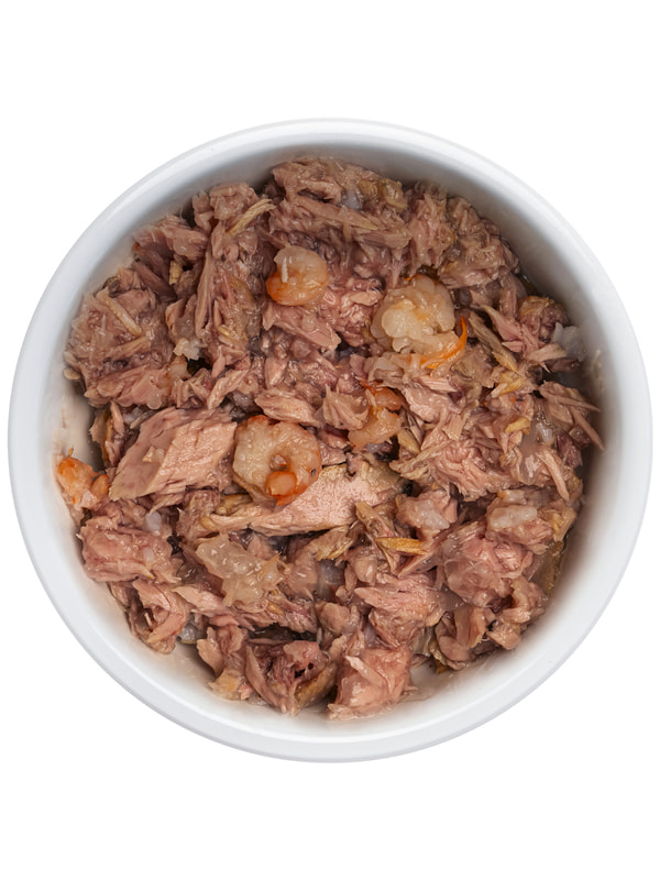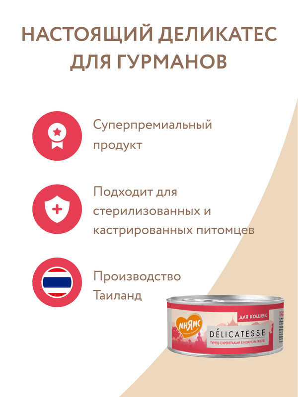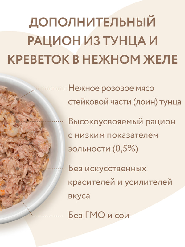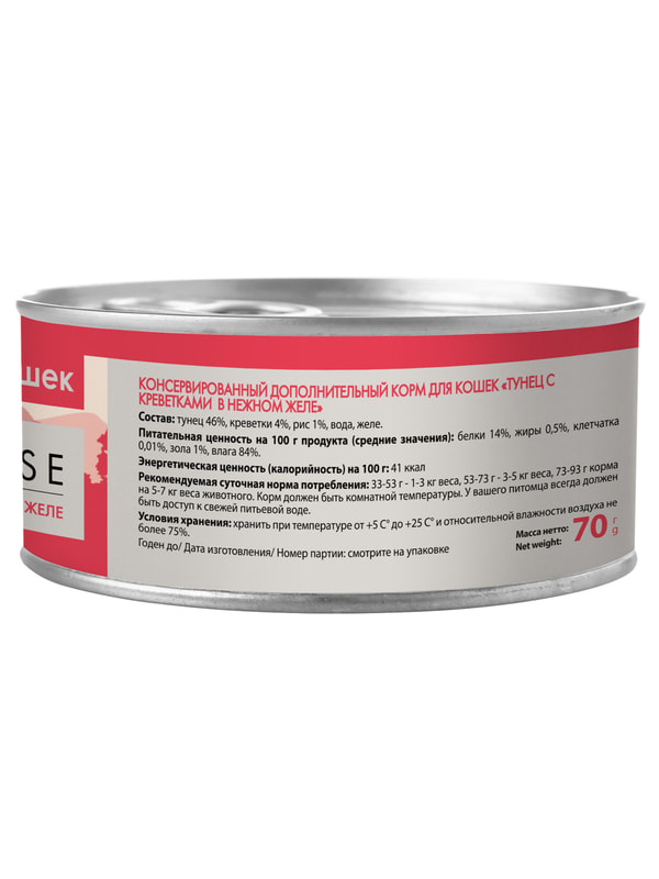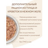 Ингредиенты: тунец 46%, креветки 4%, рис 1%, вода, желе.