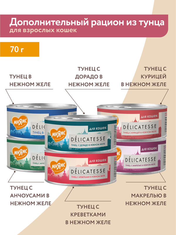 Консервы для кошек «Мнямс» состоят исключительно из отборных натуральных компонентов и не содержат сою, искусственные красители и усилители вкуса.