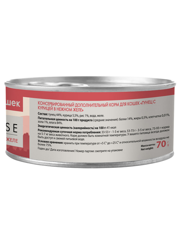 Ингредиенты: тунец 44%, курица 5,5%, рис 1%, вода, желе.