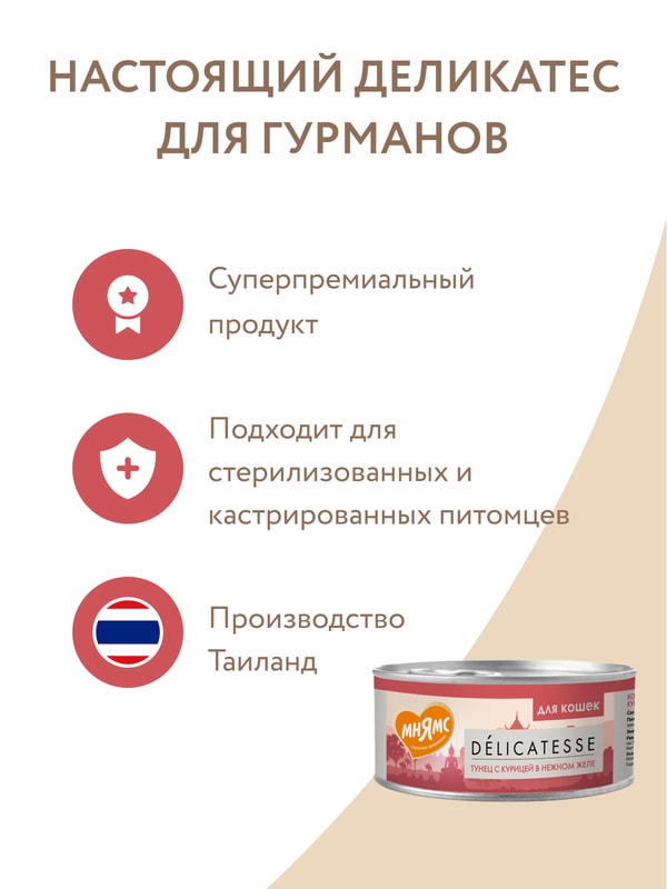 Консервы для кошек «Мнямс» состоят исключительно из отборных натуральных компонентов и не содержат сою, искусственные красители и усилители вкуса.