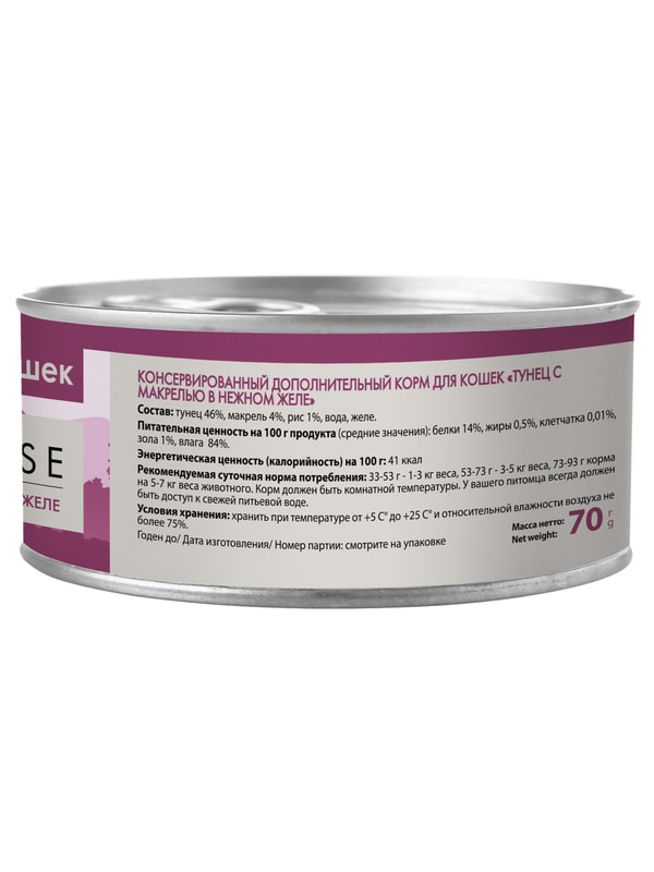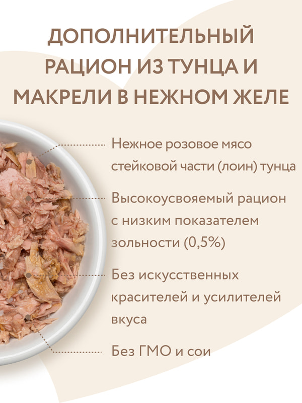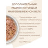 Ингредиенты: тунец 46%, макрель 4%, рис 1%, вода, желе.
