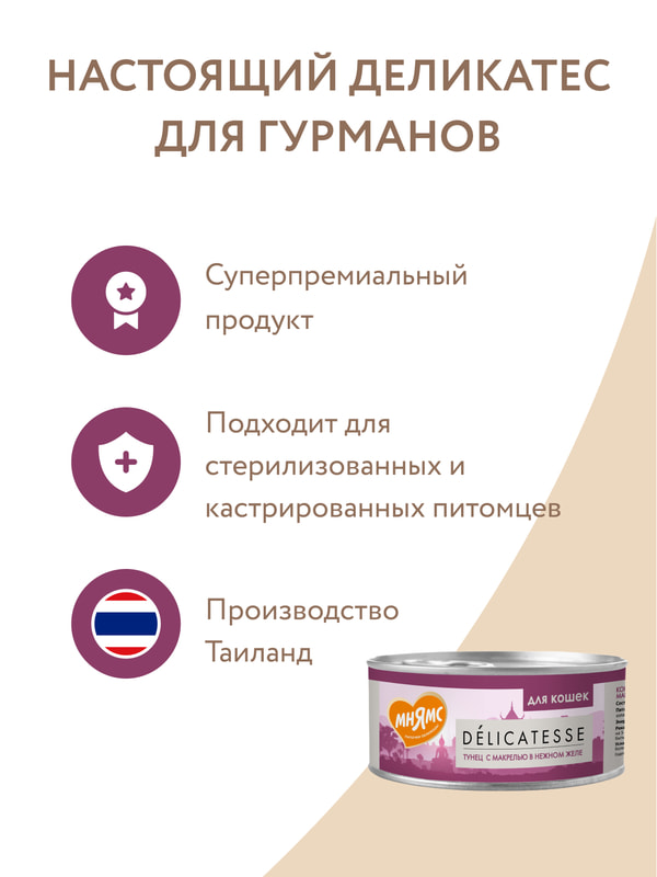 Консервы для кошек «Мнямс» состоят исключительно из отборных натуральных компонентов и не содержат сою, искусственные красители и усилители вкуса.