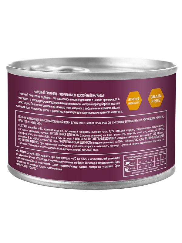 Нежный паштет из индейки - это идеальный прикорм для котят с начала прикорма, а также рацион поддерживающий организм матери в период беременности и лактации.
