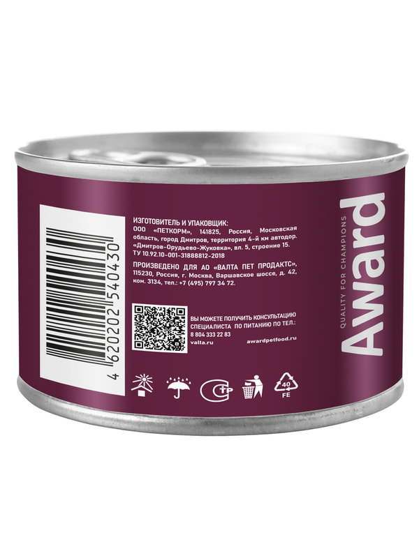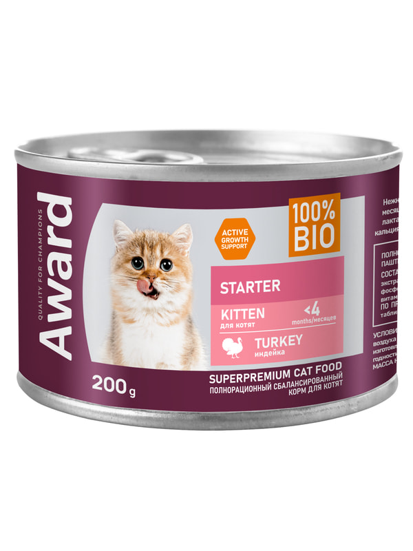 Влажный корм AWARD для котят с начала прикорма до 4 месяцев, беременных и кормящих кошек паштет из индейки 200г.