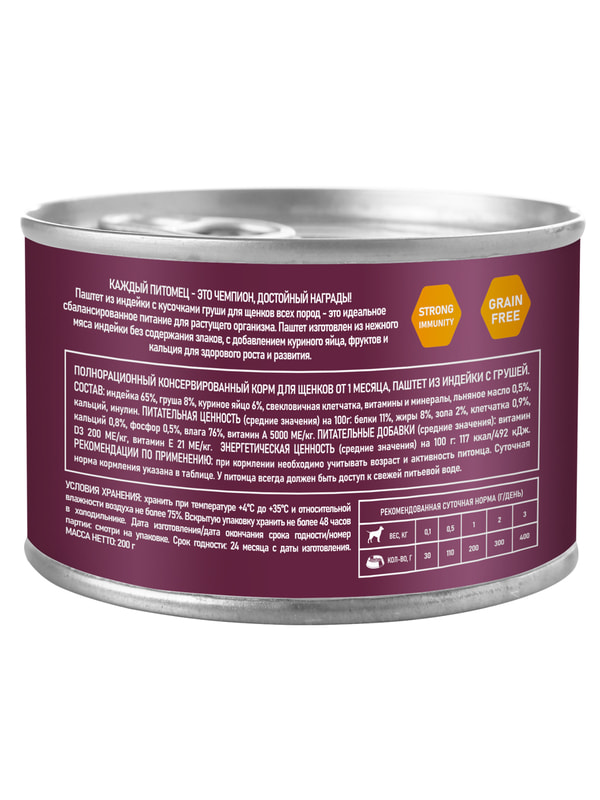 Паштет из индейки с кусочками груши для щенков - это сбалансированное питание для растущего организма, изготовленое из мяса индейки, без содержания зерна и глютена, с добавлением овощей и фруктов богатых витаминами и минералами.