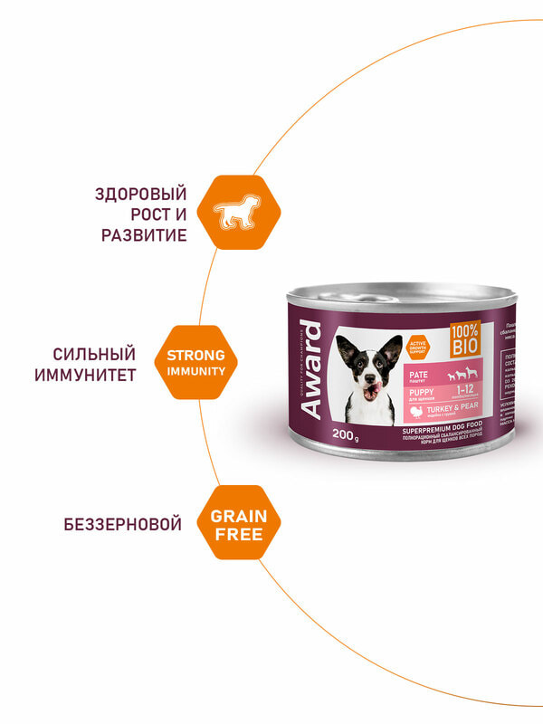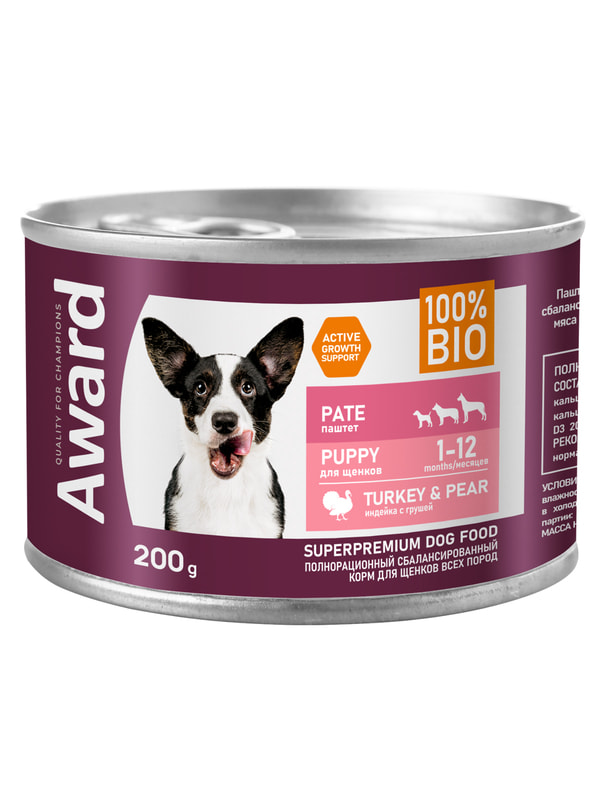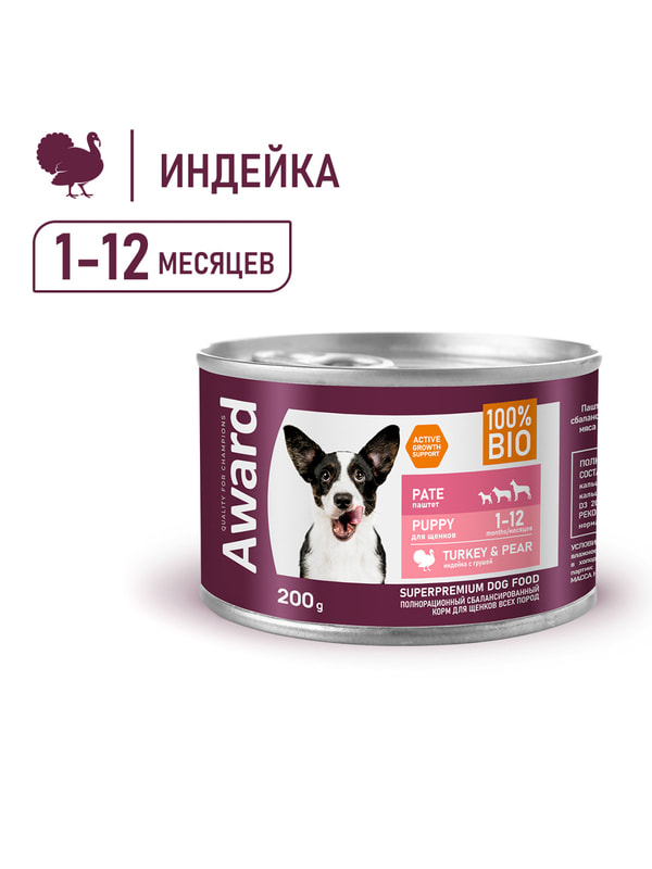 Повседневные корма Award Влажный корм AWARD для щенков от 1 месяца паштет из индейки с грушей 200г