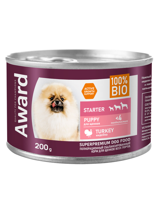 Повседневные корма Award Влажный корм AWARD для щенков с начала прикорма до 4 месяцев, беременных и кормящих сук паштет из индейки 200г