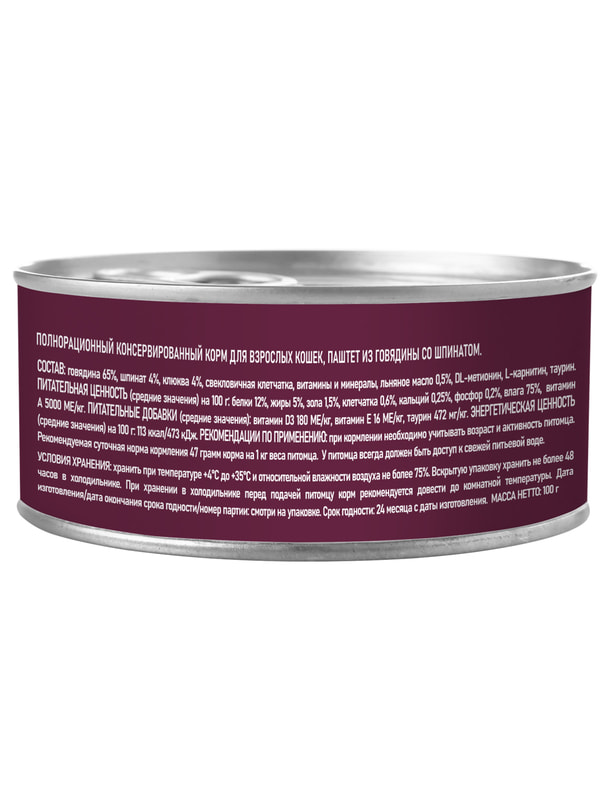 Паштет из говядины с кусочками шпината для взрослых кошек - это монопротеиновое сбалансированное питание для любимого питомца, изготовленое из одного вида мясного белка без содержания зерна и глютена, с добавлением овощей и фруктов богатых витаминами и минералами.