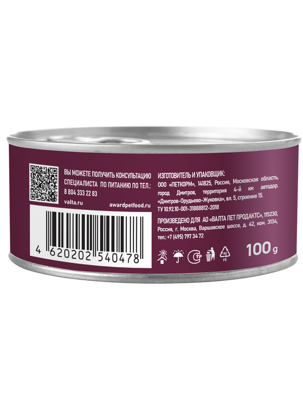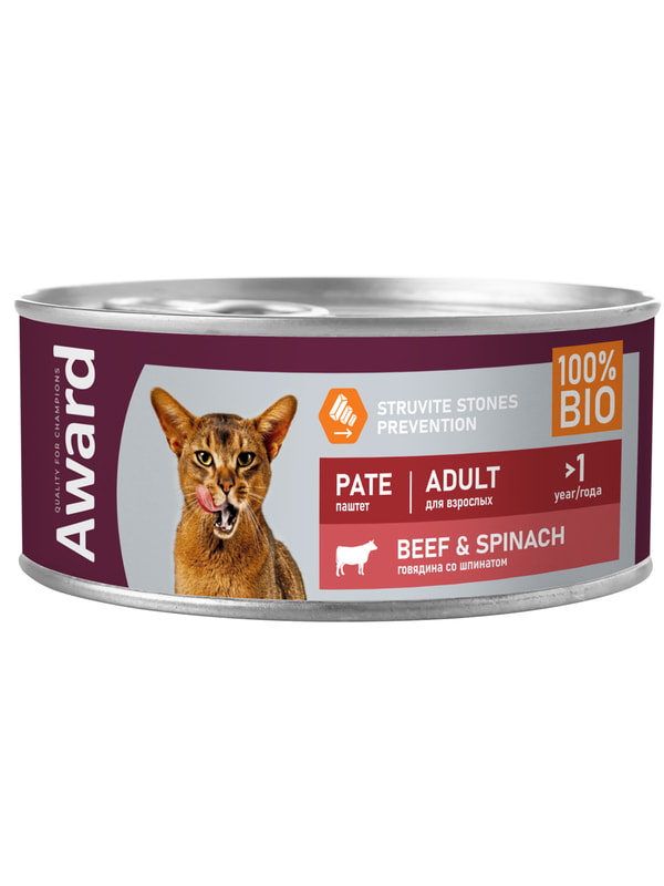Влажный корм AWARD для взрослых кошек паштет из говядины со шпинатом 100г.