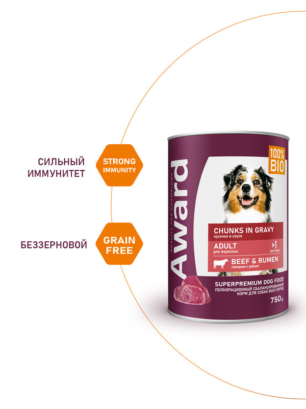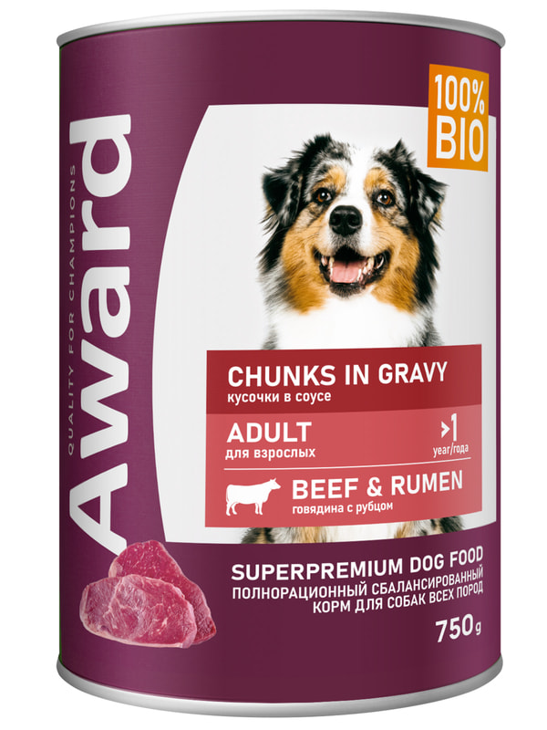 Повседневные корма Award Влажный корм AWARD для взрослых собак кусочки с говядиной и рубцом в соусе 750г