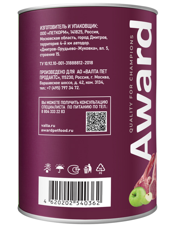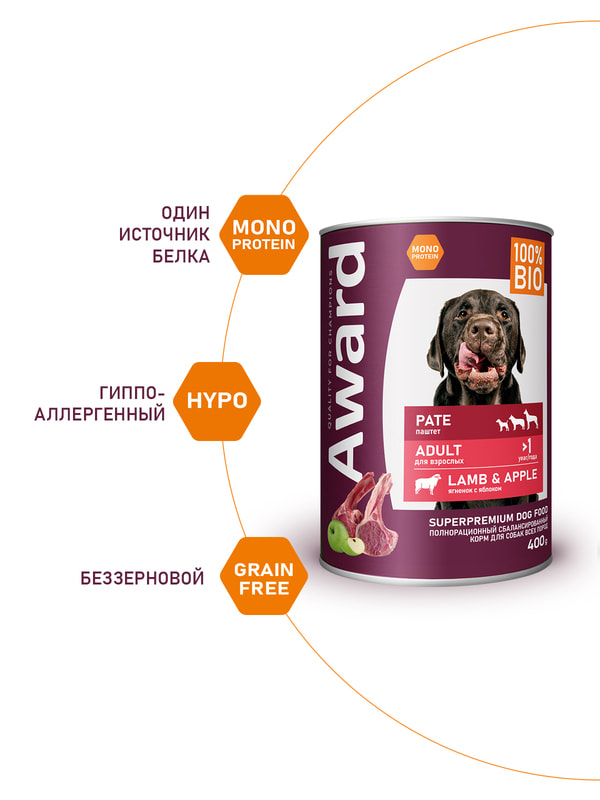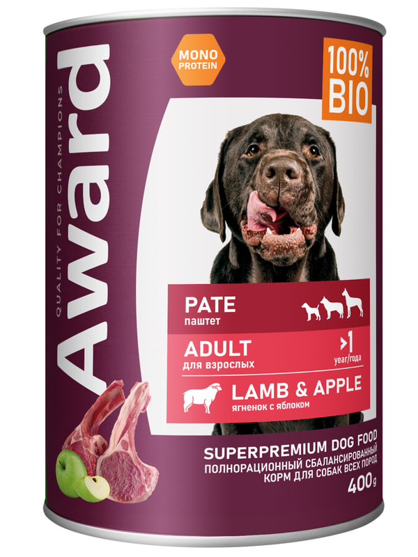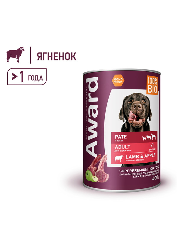 Повседневные корма Award Влажный корм AWARD для взрослых собак паштет из ягненка с яблоком 400г