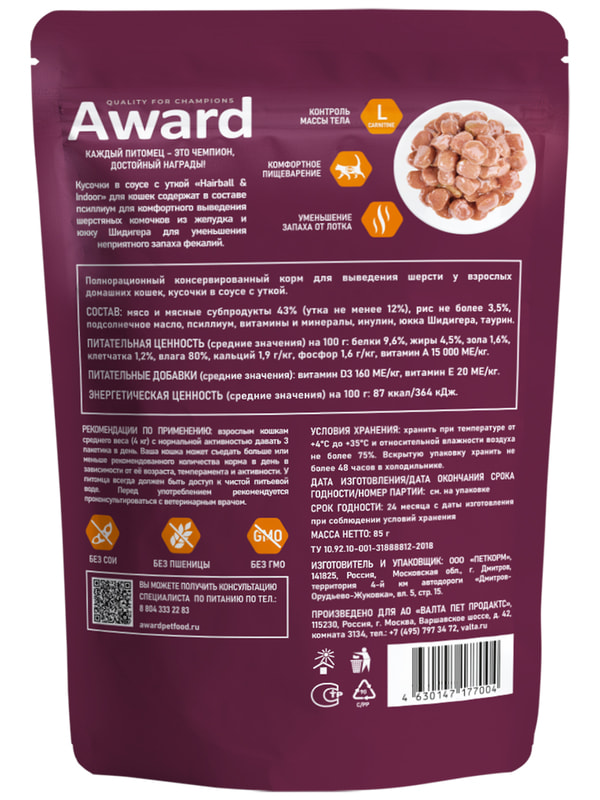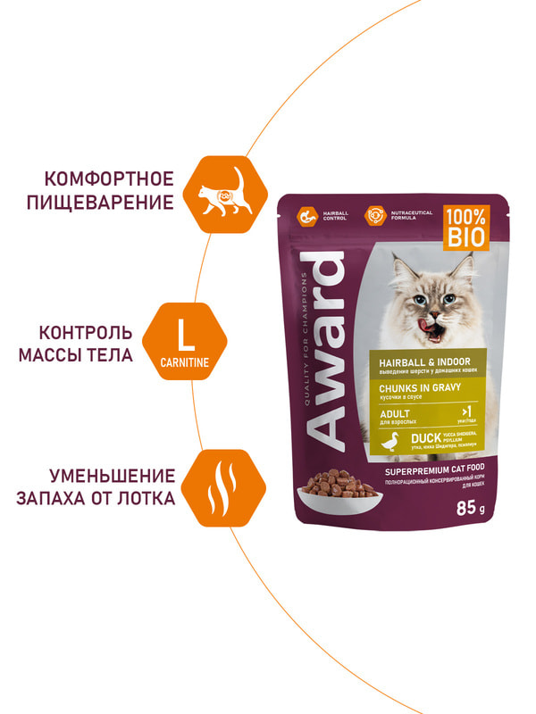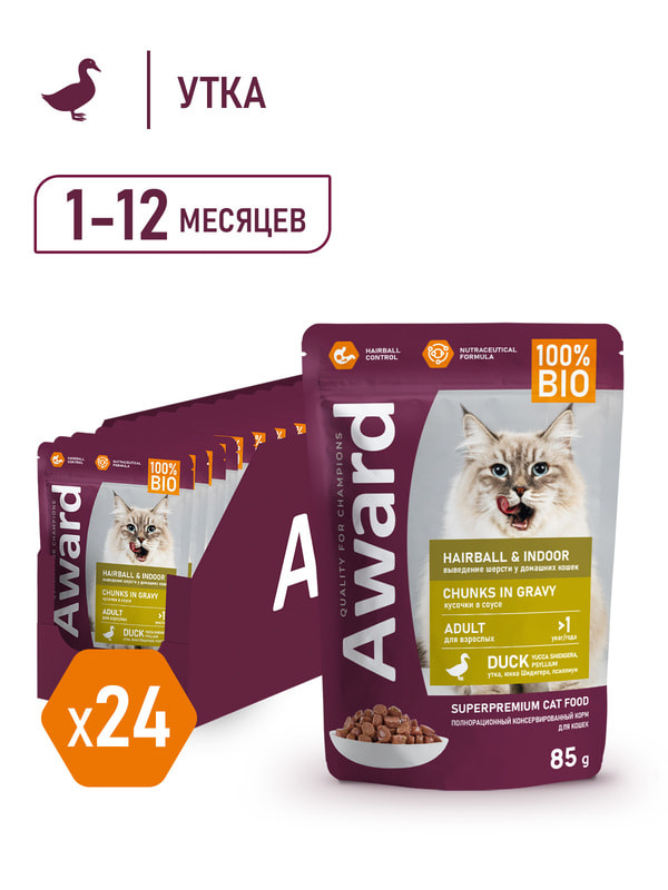 Повседневные корма Award Влажный корм AWARD Hairball & Indoor для выведения шерсти у взрослых домашних кошек кусочки в соусе с уткой 85г