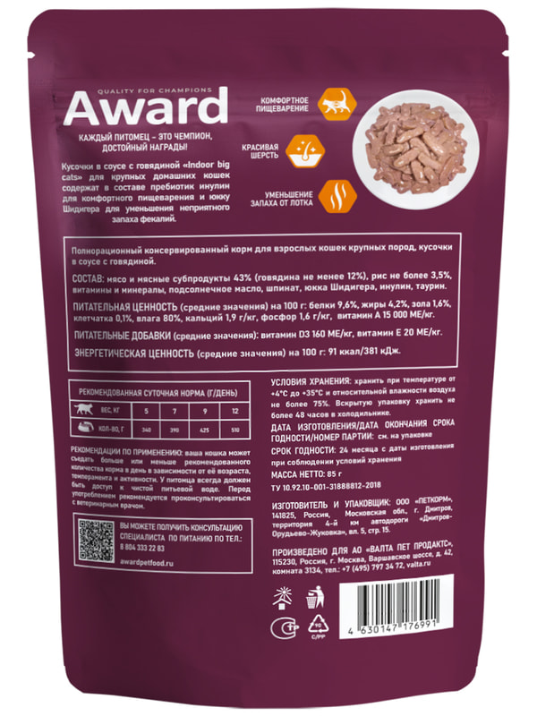 AWARD Полнорационный консервированный корм «Indoor big cats» для взрослых домашних кошек крупных пород, кусочки в соусе с говядиной 85 г.