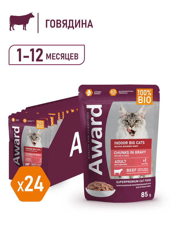 Повседневные корма Award Влажный корм AWARD Indoor big cats для взрослых домашних кошек крупных пород кусочки в соусе с говядиной 85г