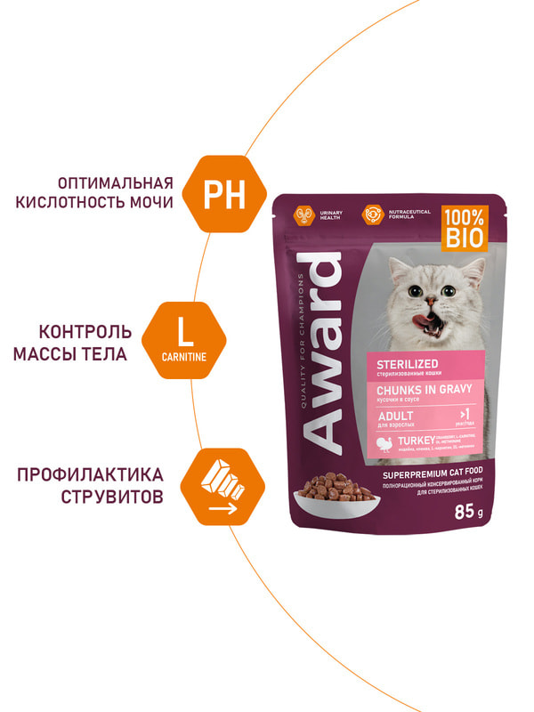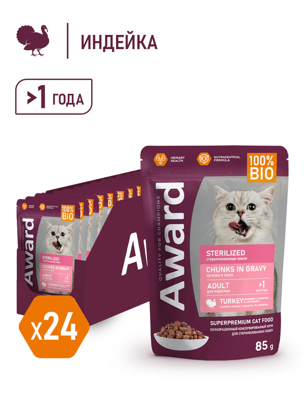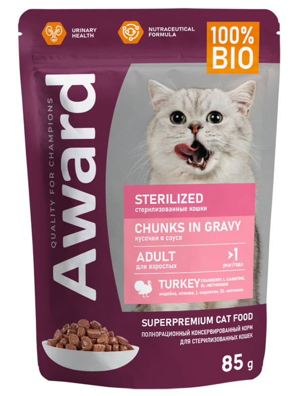AWARD Полнорационный консервированный корм «Sterilized» для взрослых стерилизованных кошек, кусочки в соусе с индейкой 85 г.
