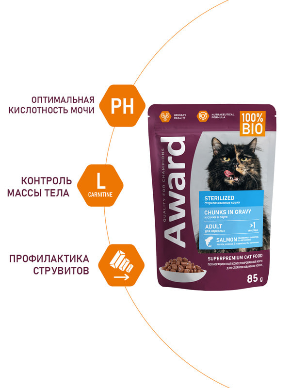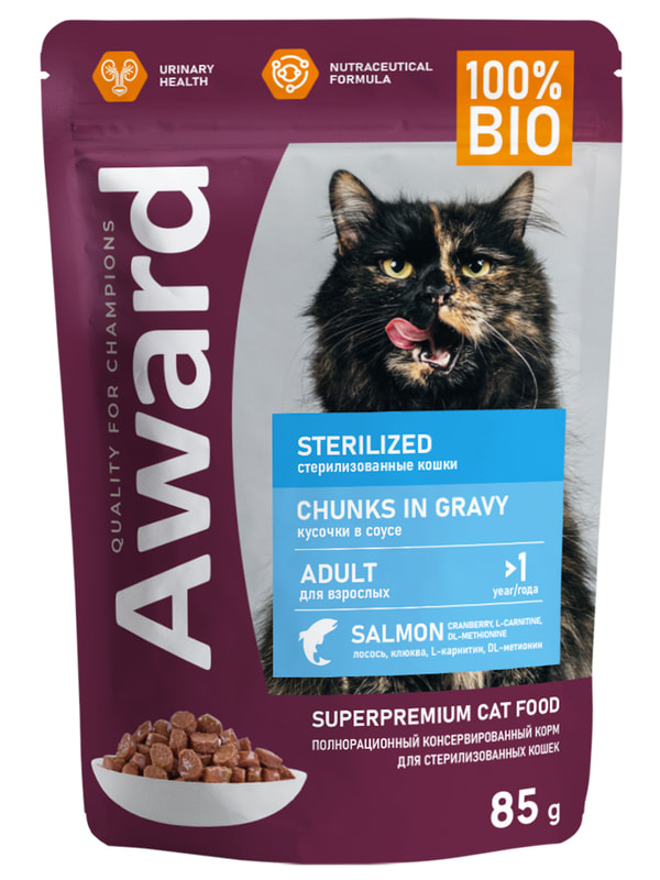 AWARD Полнорационный консервированный корм «Sterilized» для взрослых стерилизованных кошек, кусочки в соусе с лососем 85 г.