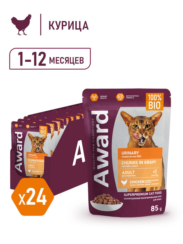 AWARD Полнорационный консервированный корм «Urinary» для профилактики мочекаменной болезни у взрослых кошек, кусочки в соусе с курицей 85 г.