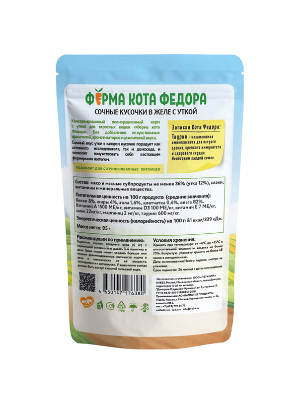 Влажный корм с Фермы кота Фёдора - это сбалансированный рацион, который обязательно понравится вашей кошке.