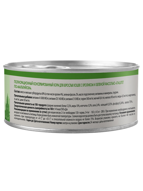 Полнорационный сбалансированный влажный корм с кроликом и зеленой фасолью для кошек старше 12 месяцев, созданный по мотивам блюд высокой кухни. "Паштет по-мальтийски" содержит высокое количество животного белка (69%), зеленую фасоль, таурин, а также все необходимые витамины и минералы для поддержания здоровья и активности кошки на протяжении всей ее жизни.