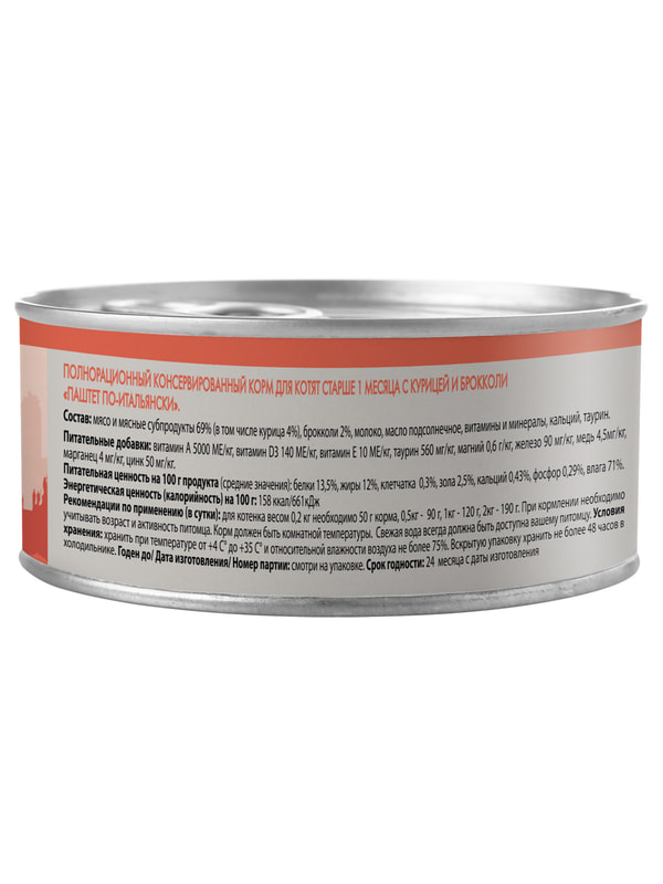 Полнорационный сбалансированный влажный корм с курицей и брокколи для котят старше 1 месяца, созданный по мотивам блюд высокой кухни. "Паштет по-итальянски" содержит высокое количество животного белка (69%), молоко, кальций, таурин, а также все необходимые витамины и минералы, обеспечивающие рост и правильное развитие котенка.