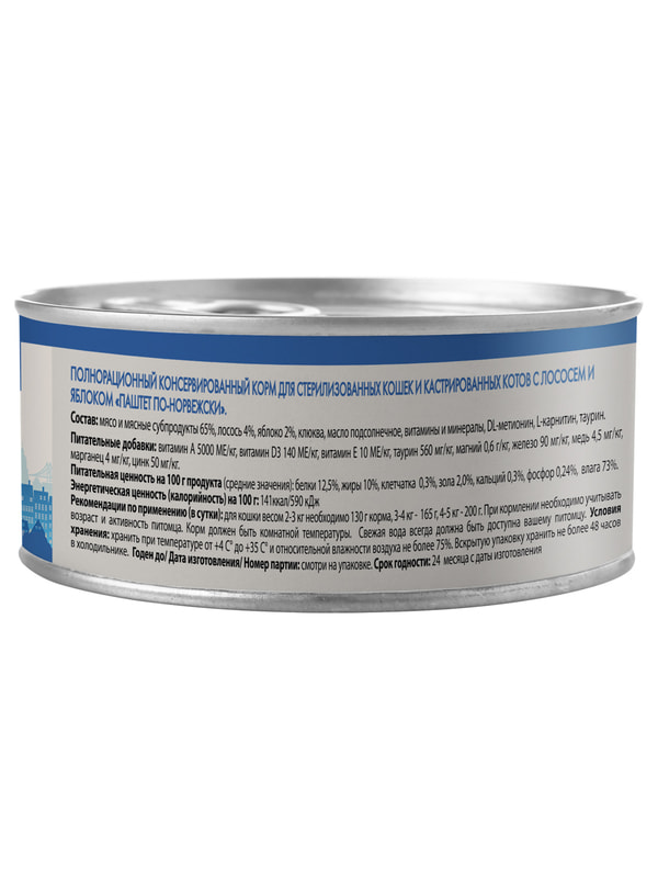 Полнорационный сбалансированный влажный корм с лососем и яблоком для стерилизованных кошек и кастрированных котов старше 12 месяцев, созданный по мотивам блюд высокой кухни. "Паштет по-норвежски" содержит высокое количество животного белка (65%), лосось, яблоко, клюкву, витамины и минералы, DL-метионин, L-карнитин, обеспечивающие контроль веса и снижающие риск развития мочекаменной болезни, а также незаменимую аминокислоту - таурин.