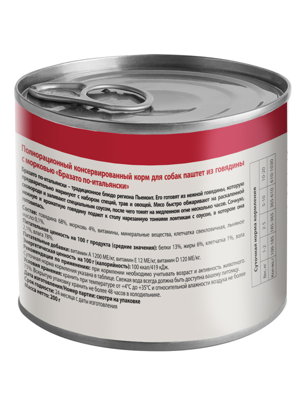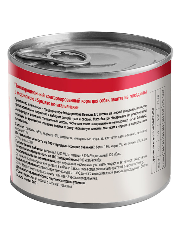 Полнорационный консервированный корм для собак "Бразато по-итальянски". Паштет из говядины с морковью.