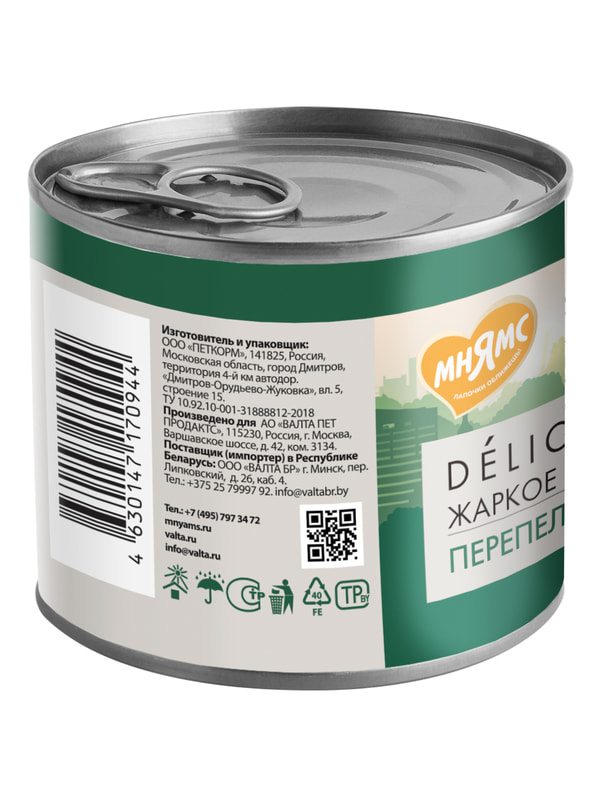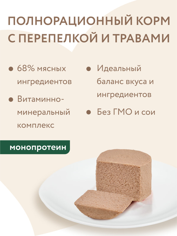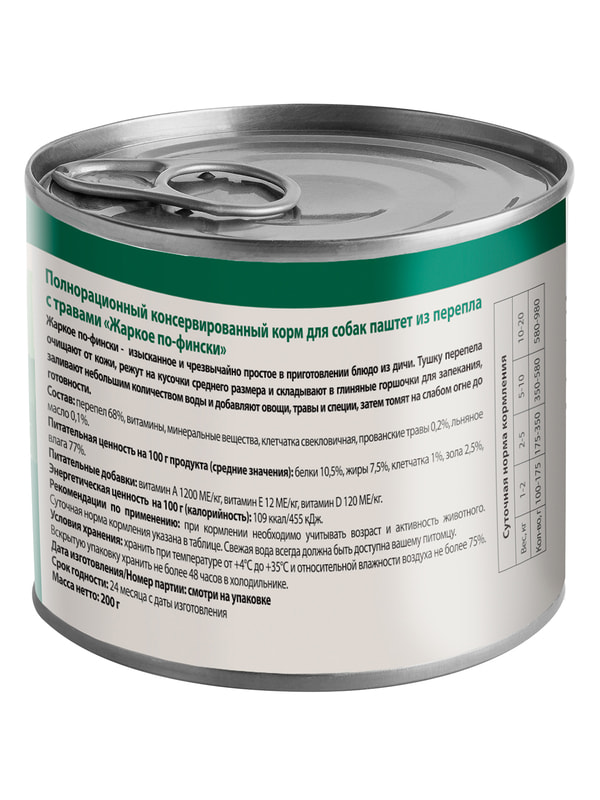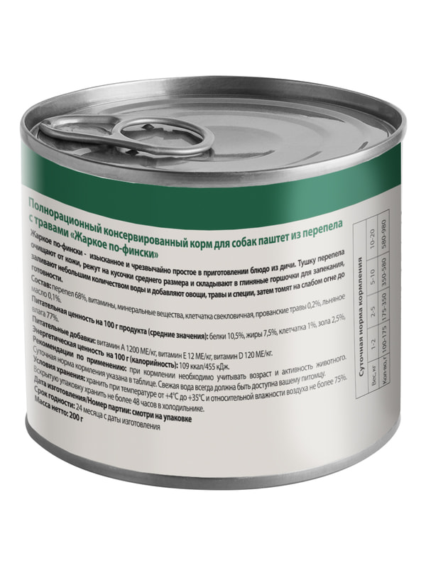 Полнорационный консервированный корм для собак "Жаркое по-фински". Паштет из перепёлки с травами.