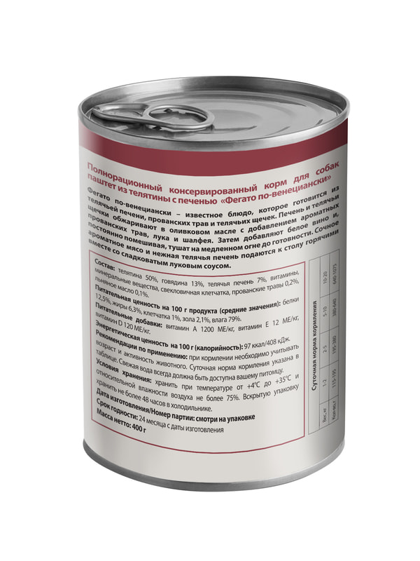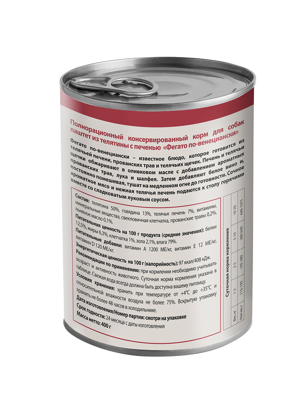 Полнорационный консервированный корм для собак "Фегато по-венециански". Паштет из телятины с печенью.