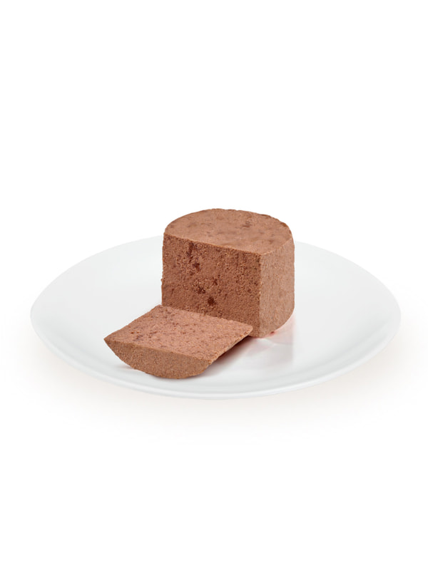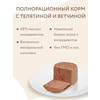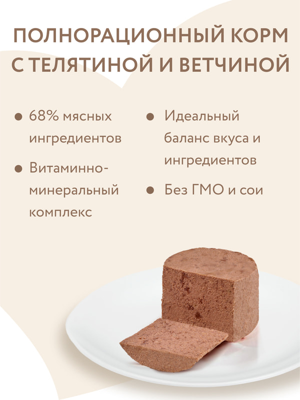 Ингредиенты: Состав: телятина 58%, ветчина свиная 10%, витамины, минеральные вещества, свекловичная клетчатка, льняное масло 0,1%.