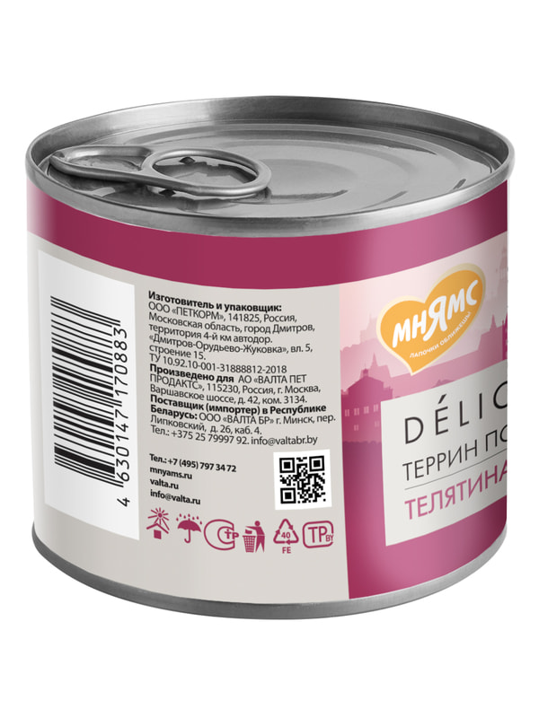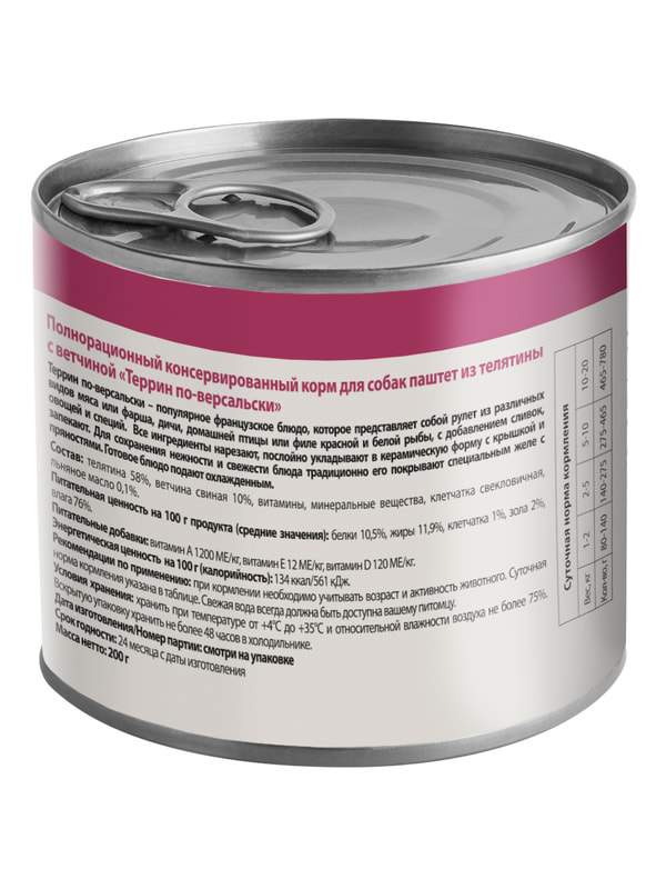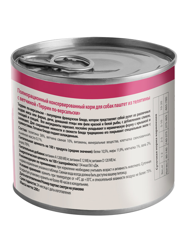 Полнорационный консервированный корм для собак "Террин по-версальски". Паштет из телятины с ветчиной.