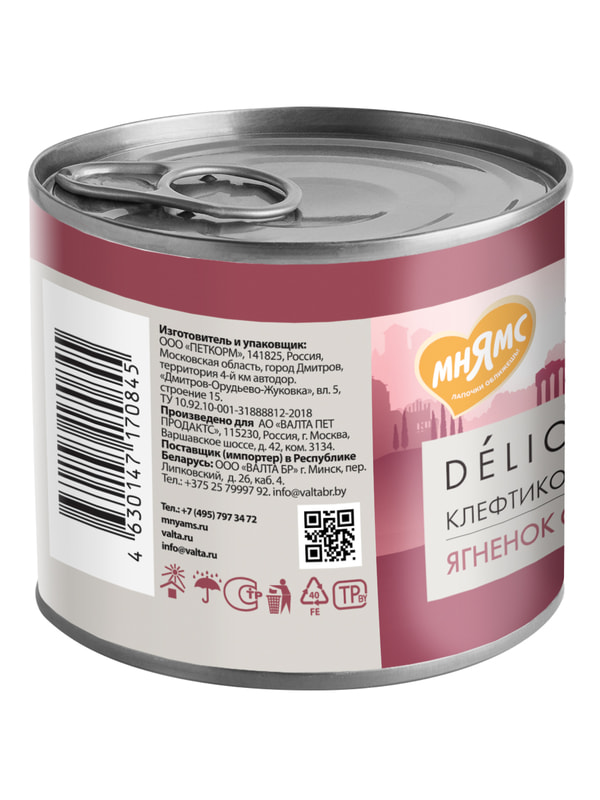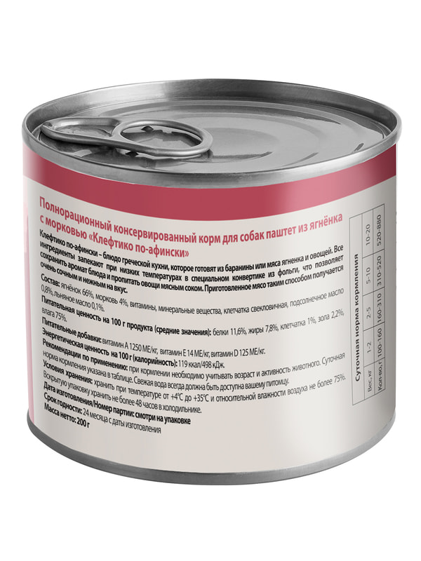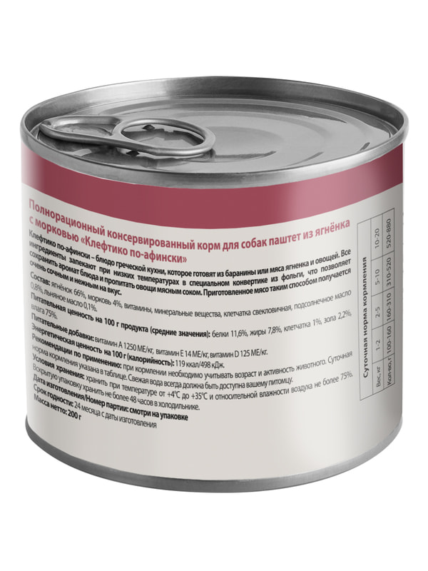 Полнорационный консервированный корм для собак "Клефтико по-афински". Паштет из ягнёнка с морковью.