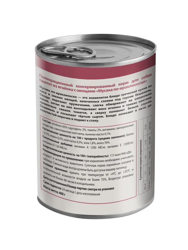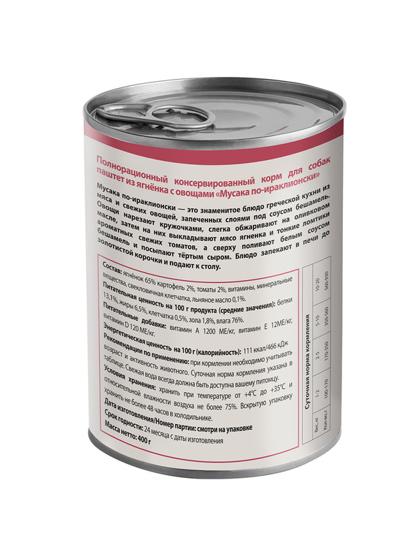 Полнорационный консервированный корм для собак всех пород "Мусака по-ираклионски". Паштет из ягнёнка с овощами.